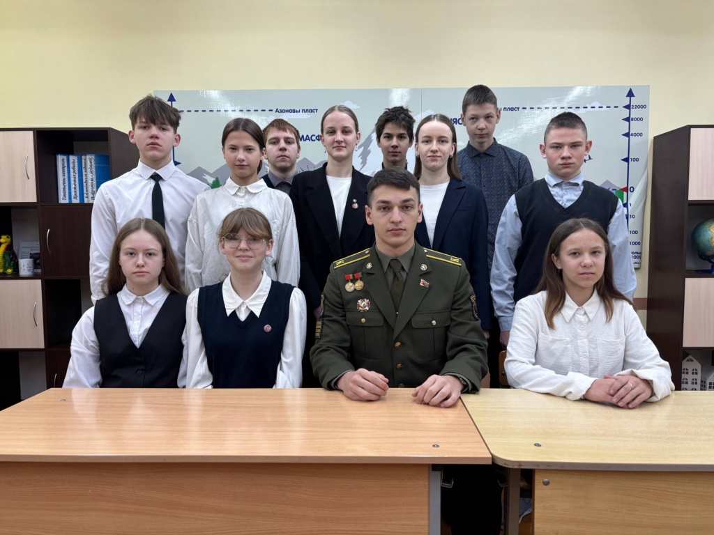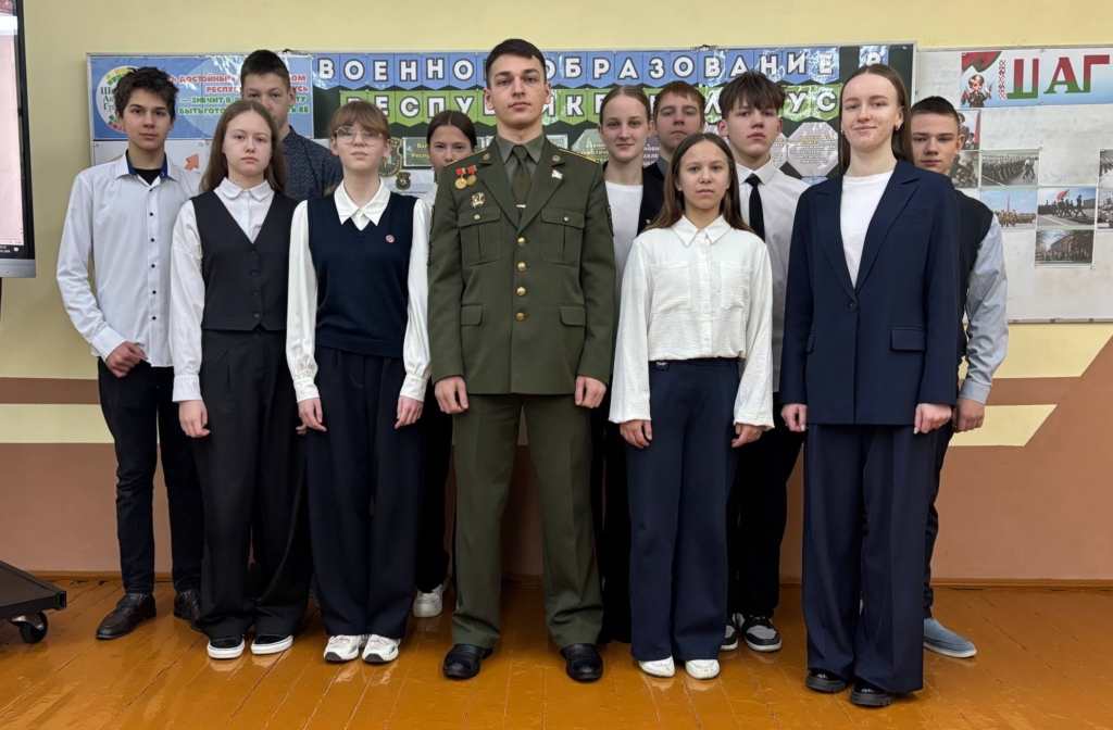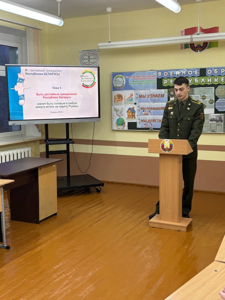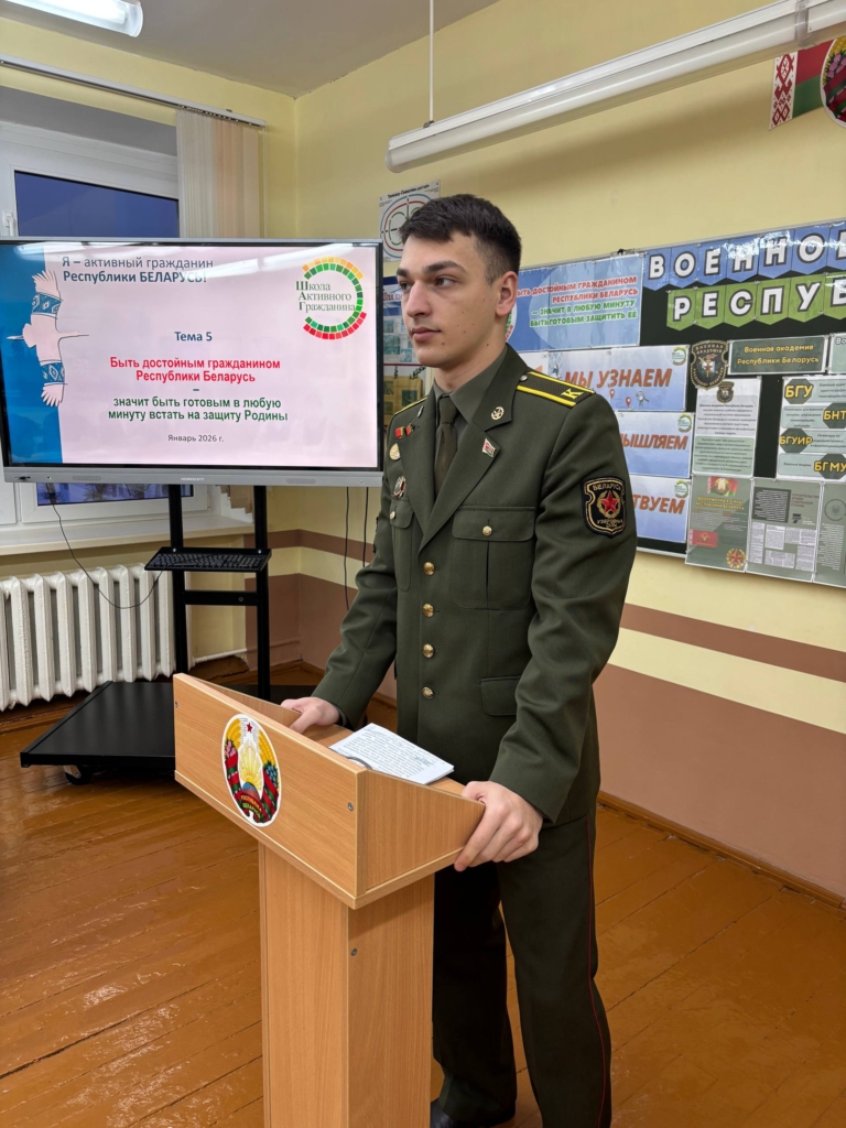 29.01.2026 в рамках информационно-образовательного проекта «ШАГ» – «Школа Активного Гражданина» – для учащихся 8-11 классов в учреждении образования прошел единый день информирования. Тема: «Быть достойным гражданином Республики Беларусь – значит быть готовым в любую минуту встать на защиту Родины». Приглашённый: Александрович Денис Витальевич, курсант Военного факультета в Белорусском государственном университете. Начало в 8.00.